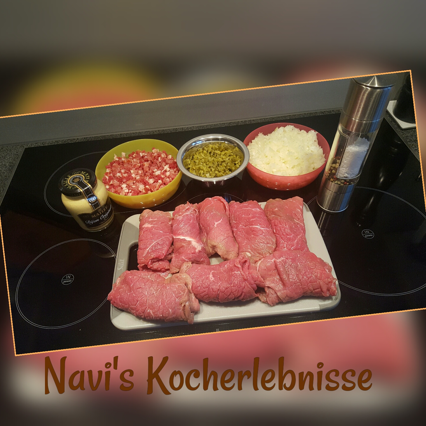 Was gehört nun alles in die Füllung der Rouladen? Speck und Zwiebel (Mutter), Gurke und Senf (Schwiegermutter), Salz und Pfeffer (beide).
